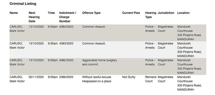 According to the Australian justice department’s on-line court portal, Caruso is due to face three charges – two of common assault and one of aggravated home burglary – in the Mandurah court house on 13 October. Mandurah is a coastal city in Western Australia, some 72km south of the state capital Perth. Caruso has not yet entered a plea in respect of the three charges.