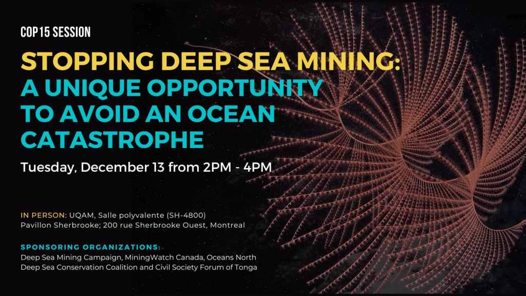 Join MiningWatch, the Deep Sea Mining Campaign, the Civil Society Forum of Tonga, the Deep Sea Conservation Coalition, and Oceans North at a side event organized during COP15 in Montreal.