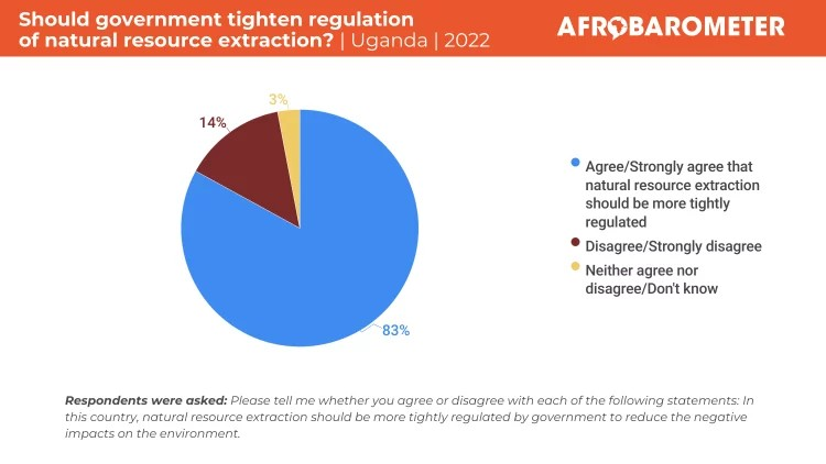 - Fully half (51%) of Ugandans see the costs of natural resource extraction, such as environmental pollution, as outweighing its benefits, such as jobs and revenues. Only 41% value the benefits more highly than the costs.
