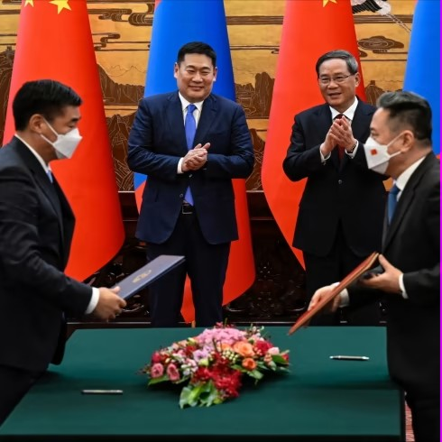 Mongolia’s Luvsannamsrain Oyun-Erdene, background left, and China’s premier Li Qiang applaud at a signing ceremony in Beijing in late June. China accounts for 84% of Mongolian exports, such as copper and coal © Jade Gao via Reuters