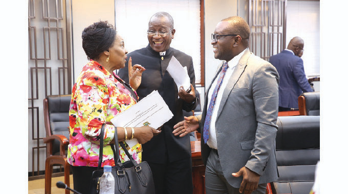 Information, Publicity and Broadcasting Services Minister Dr Jenfan Muswere (right), Women Affairs, Community, Small and Medium Enterprises Development Minister Senator Monica Mutsvangwa (left) and Justice, Legal and Parliamentary Affairs Minister Ziyambi Ziyambi chat after a post-Cabinet media briefing in Harare yesterday. — Picture: Joseph Manditswara.