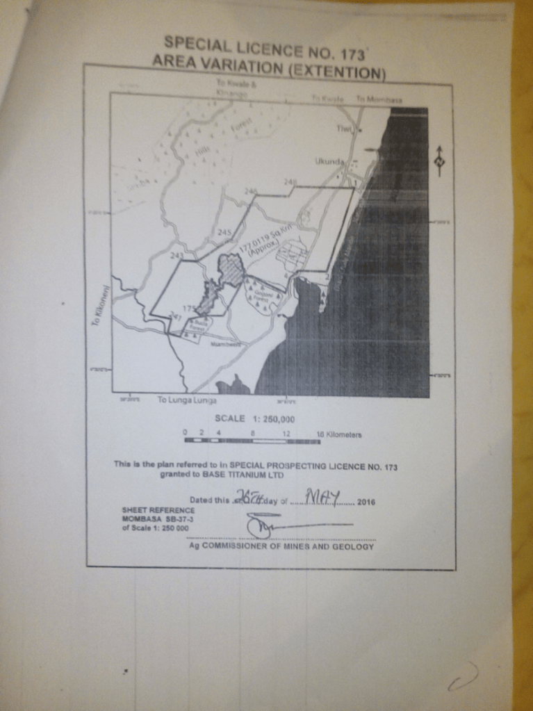 Special Prospecting Licence (No. 173) issued to Base Titanium Ltd. in 2016, under the old Mining Act (Cap 306)