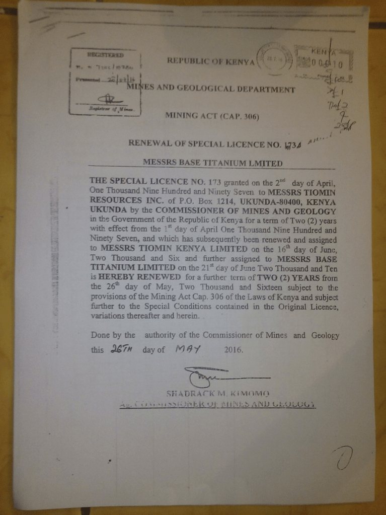 N.B: Pursuant to the above, Base Titanium Ltd. was issued with a “Special Prospecting Licence” (see below) on 26th May 2016 under the old Mining Act – six days after the new Mining Act had been gazetted, and a day before the new Act came into effect. Therefore, Base Titanium Ltd. was conducting mining operations contrary to the above Public Notice.